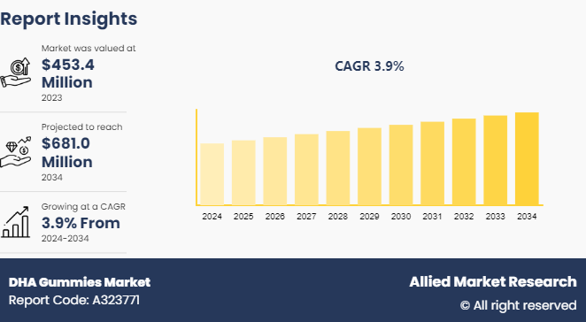 WILMINGTON, DE, UNITED STATES, October 23, 2025 /EINPresswire.com/ -- The DHA gummies industry was valued at $453.4 million in 2023, and is estimated to reach $681.0 million by 2034, growing at a CAGR of 3.9% from 2024 to 2034.Leading key Players: -